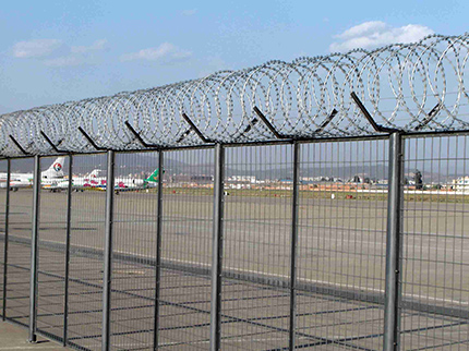 飛行區(qū)鋼筋網(wǎng)圍界一般采用5.0mm的優(yōu)質(zhì)低碳鋼絲焊接;網(wǎng)孔(mm) 50x100 50x150 50x200網(wǎng)片中帶有Y型加強(qiáng)筋可增強(qiáng)護(hù)欄網(wǎng)的抗沖擊力。立柱為60X60矩形鋼,頂端含有Y型支架或者采用70mmX100mm的掛式連接立柱,飛行區(qū)鋼筋網(wǎng)圍界網(wǎng)片鏈接采用特制SBS扣件,有效防止人為破壞性拆卸,產(chǎn)品均為熱鍍鋅后采用高質(zhì)量的聚酯粉末靜電噴涂,采用國(guó)際流行的RAL顏色,飛行區(qū)鋼筋網(wǎng)圍界主要用途:機(jī)場(chǎng)封閉 、私人地域、軍事重地、 場(chǎng)區(qū)圍網(wǎng)、 開(kāi)發(fā)區(qū)隔離網(wǎng)使用;